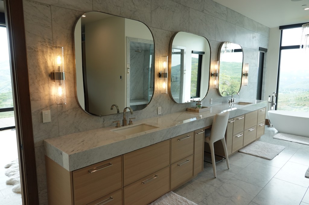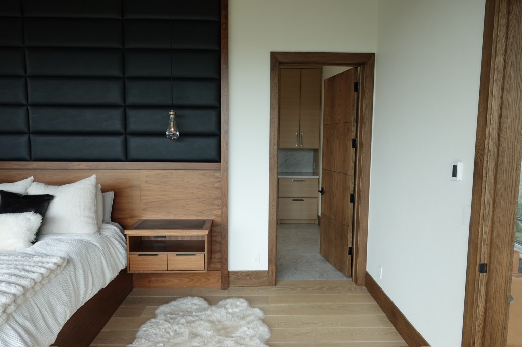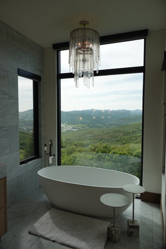 The primary suite is a serene retreat designed to immerse you in nature and luxury. Floor-to-ceiling windows frame breathtaking mountain views, flooding the space with natural light and creating a seamless connection to the outdoors. Rustic wood beams stretch across the ceiling, adding warmth and architectural interest. At the center, a custom bed with a full leather headboard offers both comfort and sophistication. The spa-like bathroom features a custom marble design and a freestanding bathtub perfectly positioned to soak in views that stretch for miles—making every moment here feel like an escape.