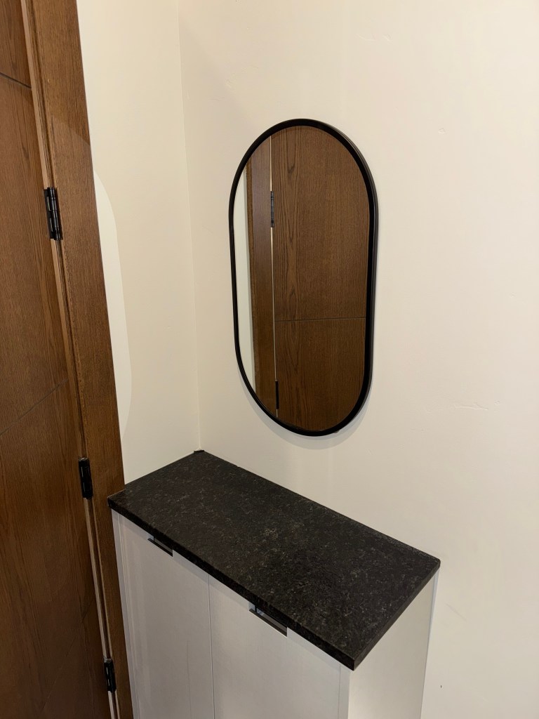 Design tip: In black-and-white bathrooms, repeating the black finish in both the mirror frame and lighting creates cohesion fast.